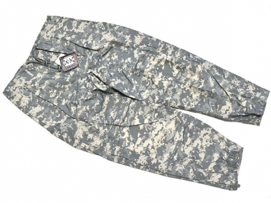 米軍実物、主に陸軍で使用されているECWCS GEN3 ACUカラーのゴアテックスパンツです。防水性の高いGore-Texを使用しており、ウエストはゴムで調節可能、両サイドポケットはインナーにアクセスするために貫通式となります。レイヤリングより防寒性を高めることができ、単体でもレインウェアとして活用いただけます。登山やアウトドア、ツーリングなどの防寒用具・雨具としておすすめ1着です。※ゴアテックスの表記はありませんが、同等の素材が使用されています。