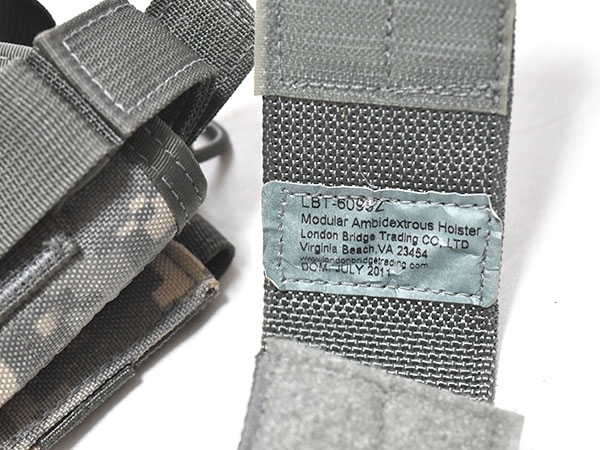 米軍実物、LBT(ロンドンブリッジトレーディング)製、ACUカラーのユニバーサルホルスターです。パーツの向きを変えることにより左右兼用で使用出来ます。背面はMOLLEクリップが付いているのでMOLLEウェビングが付いたアーマーやベルト、レッグパネルなどに取り付けが可能です。