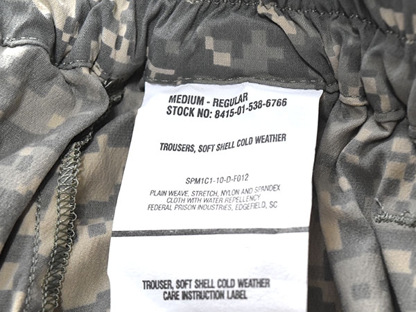 米軍実物、ECWCS (Extreme Cold Weather Clothing System) GEN3 LEVEL5、ACUカラーのソフトシェルパンツです。ポケットは両サイドと両膝上に計4つ付いています。防寒性が高くBDUの上から着用するよう設計されています。