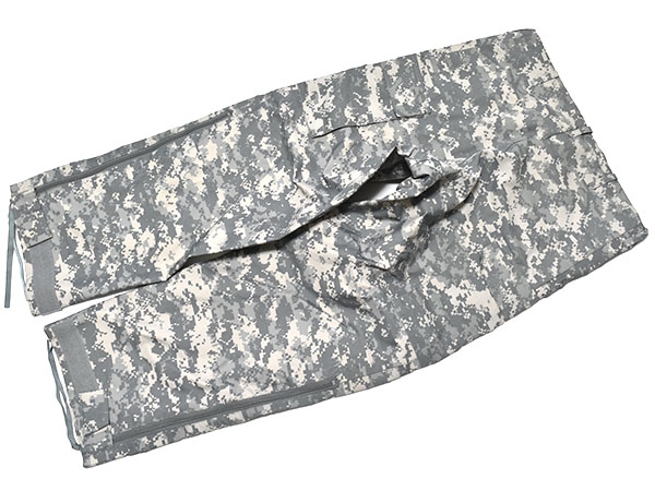 米軍実物、ECWCS (Extreme Cold Weather Clothing System) GEN2のACUカラーのゴアテックスパンツです。防水性の高いGore-Texを使用しており、ウエストはゴムで調節可能、両サイドポケットはインナーにアクセスするために貫通式となります。