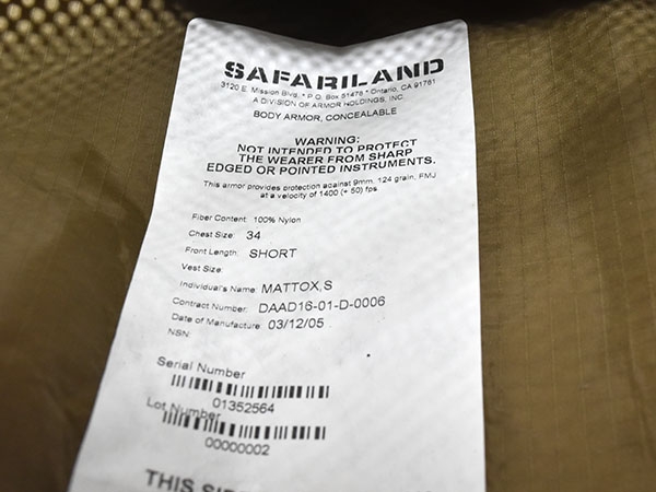 米軍実物、Safariland製、コヨーテカラーのBody Armor Concealableです。前後にソフトアーマーが入っています。