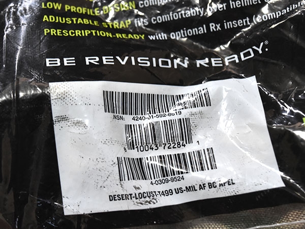 米軍実物、REVISION製、DESERT LOCUST ゴーグルです。スモークレンズ、クリアレンズ、収納袋などがセットになっています。軽量で防弾性が高く、軍規格のAPELマークの刻印入り。長時間使用を考量し設計されており、ストレスを感じにくい絶妙なフィット感があります。米陸軍一般~特殊部隊まで幅広く使用されているモデルです。