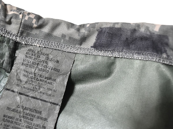 米軍実物、ECWCS (Extreme Cold Weather Clothing System) GEN2のACUカラーのゴアテックスパンツです。防水性の高いGore-Texを使用しており、ウエストはゴムで調節可能、両サイドポケットはインナーにアクセスするために貫通式となります。