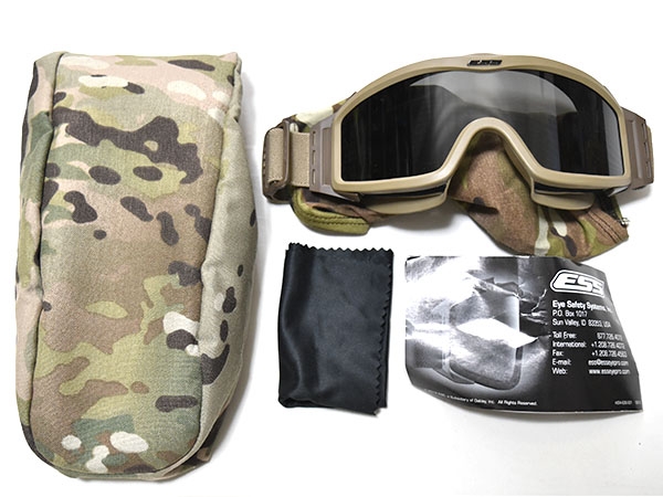 米軍実物、ESS製、タン/マルチカムカラーのPROFILE NVG ゴーグルです。軽量で柔らかいフィット感で使いやすく、米軍内で人気の高いゴーグルの一つです。収納ポーチ・クロスはREVISION製が付属します。