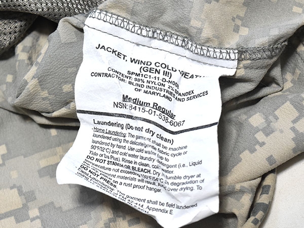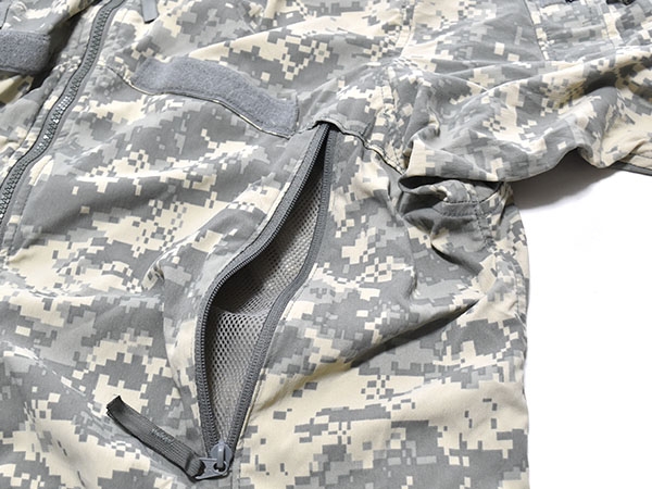 米軍実物、陸軍で使用されているACUカラーのECWCS(Extreme Cold Weather Clothing System) GEN3 LEVEL4 ウィンドジャケットです。ポケットは両サイドと肩に付属。薄い生地の防風ジャケットで、伸縮性があるナイロン系の素材を使用しています。BDUジャケットの上着として、レイヤリングにより防寒性を高めることが出来ます。