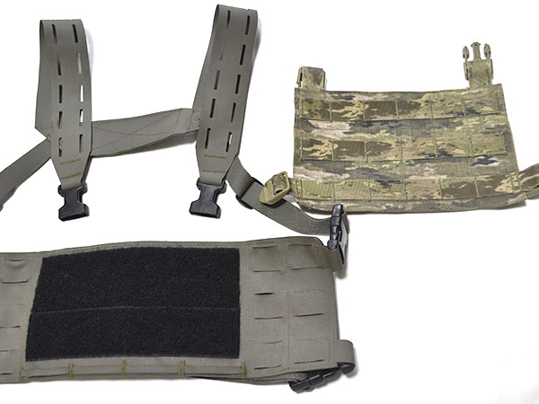 米軍放出品、EX UMBRIS製、レンジャーグリーンカラーのMACVチェストリグです。パネル中央にベルクロ式のポケットが付属。プラカードは別メーカの物かと思います。