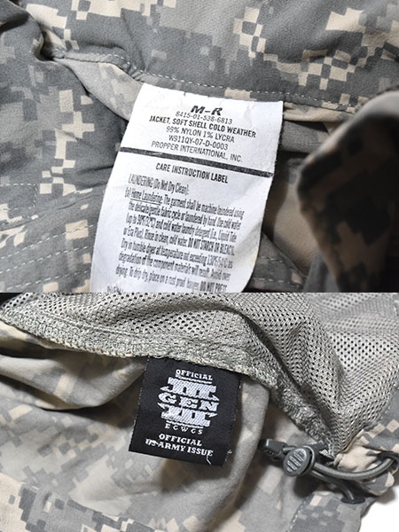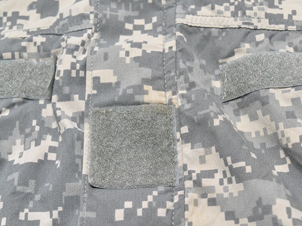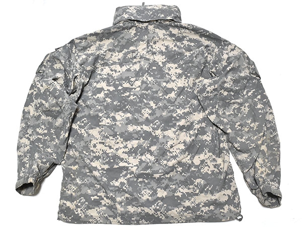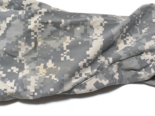米軍実物、陸軍で使用されているACUカラーのECWCS(Extreme Cold Weather Clothing System) GEN3 LEVEL5 ソフトシェルジャケットです。フードは襟に収納可能で、脇下には蒸れを軽減するためのベンチレーション、ポケットは腹部に2つ、肩に2つ付いています。ECWCSの中で最も需要があり、撥水、防風、透湿性にも優れているので秋・冬・春と長期間で着用できます。BDUジャケットやフリースの上着としておすすめの1着です。