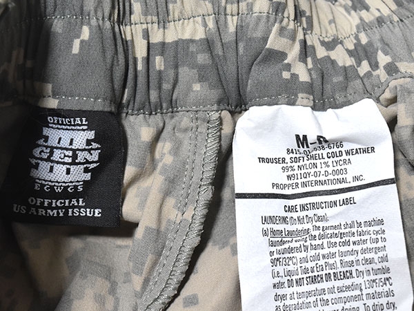 米軍実物、ECWCS (Extreme Cold Weather Clothing System) GEN3 LEVEL5、ACUカラーのソフトシェルパンツです。ポケットは両サイドと両膝上に計4つ付いています。防寒性が高くBDUの上から着用するよう設計されています。