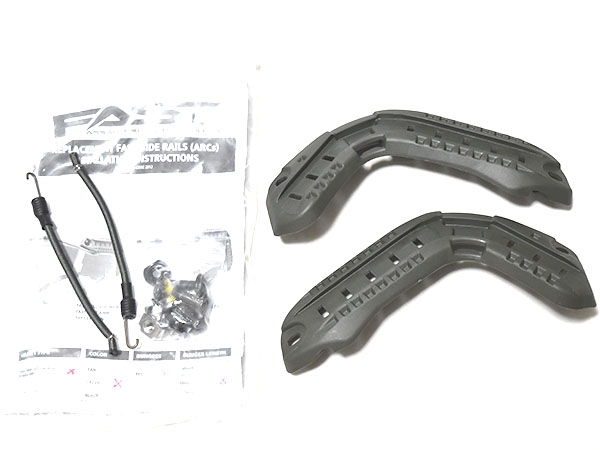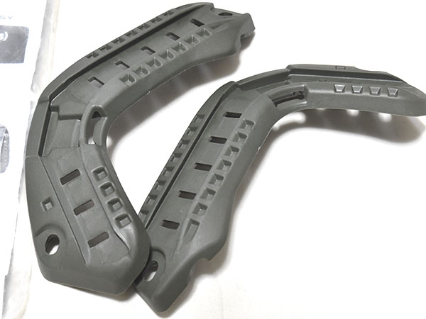 米軍実物、OPS-CORE製、ハイカット/カーボンヘルメット用のサイドレール左右セットです。グリーンカラー。バンジーコート、ボルトとナット付き。